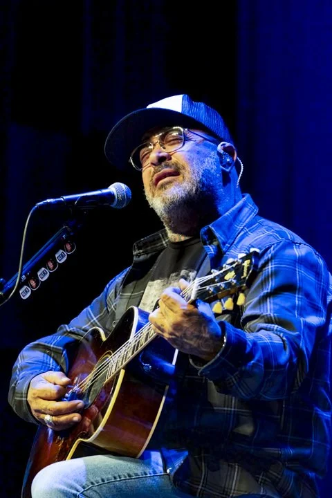 Man performing with an acoustic guitar on stage, wearing glasses, a baseball cap, and a plaid shirt, in front of a dark curtain.