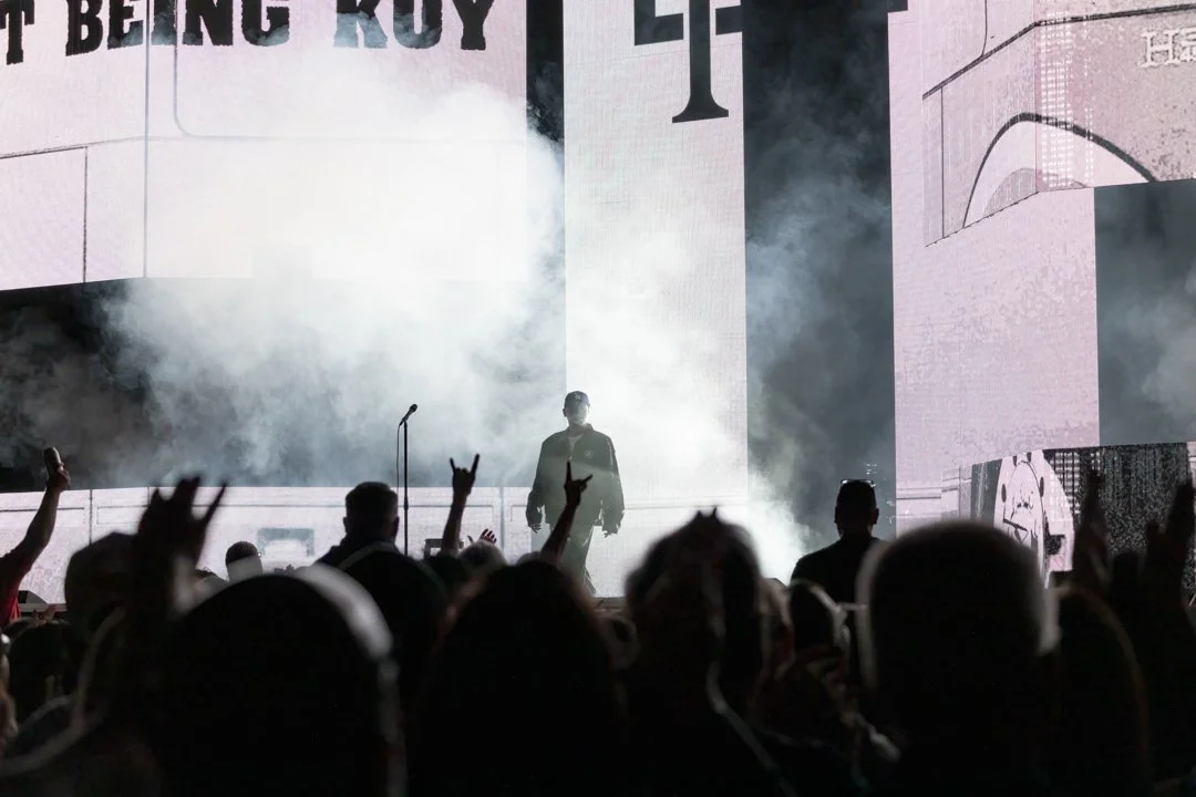 A person standing on stage with a large screen behind, surrounded by fog, with an audience in front making peace signs and raising their hands.