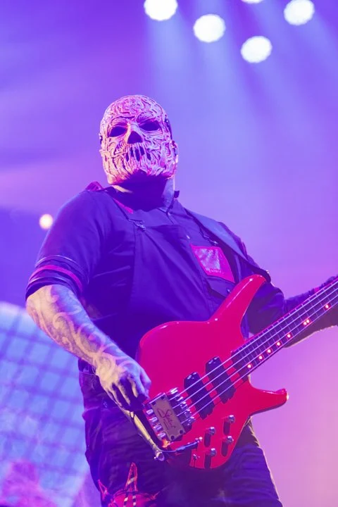 Person wearing a skull mask playing a red bass guitar on stage with purple lighting.