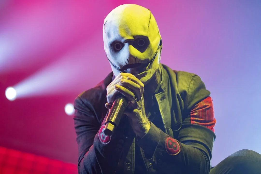 A person wearing a spooky skull mask and a black jacket, holding a microphone and performing on stage with colorful lighting.