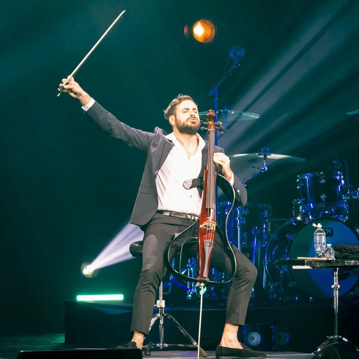 A man in a suit plays a cello on stage, raising a bow with his right hand and holding the cello with his left, with stage lights and drums in the background.