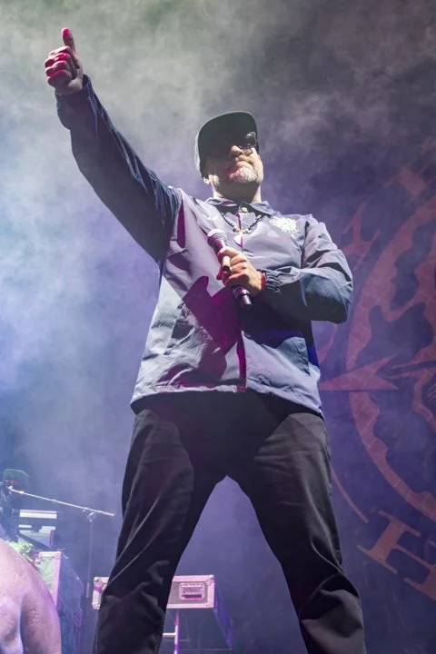 A man wearing sunglasses, a baseball cap, and a jacket holding a microphone on stage, giving a thumbs-up gesture.