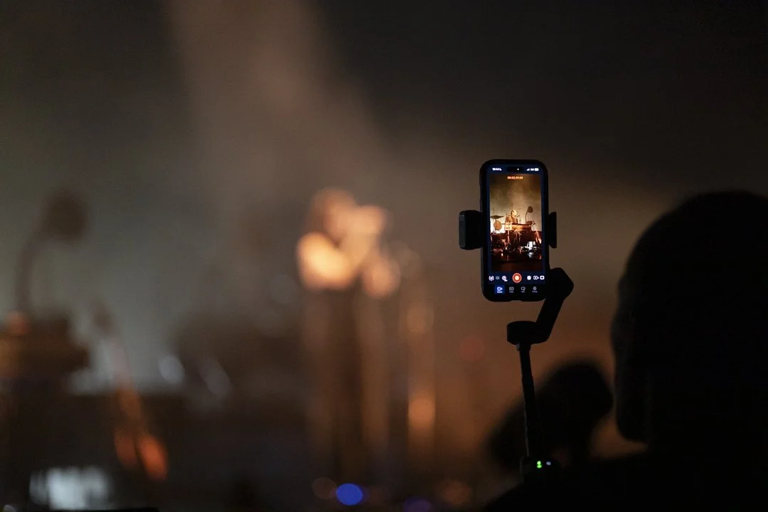 A person filming a blurry stage performance with a smartphone in a dark setting.