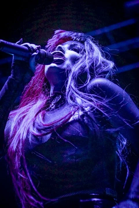 A woman singing into a microphone on stage under purple and blue stage lights.