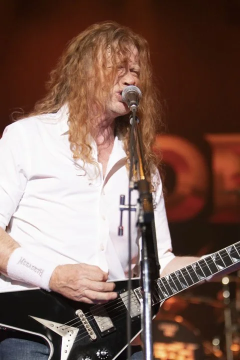 A man with long curly hair singing into a microphone while playing an electric guitar on stage.
