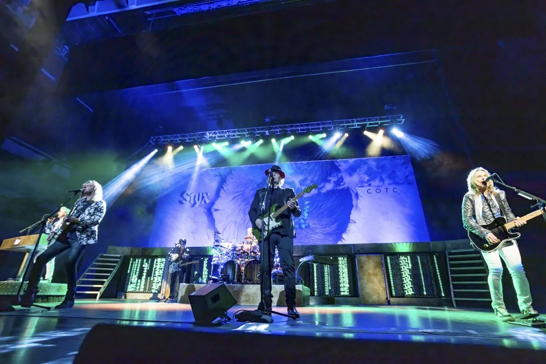 A live band performs on stage with multiple musicians playing instruments and singing, colorful stage lighting, and a large screen in the background.