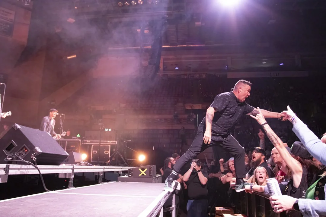 A male performer on stage interacting with the audience during a concert, with band members and stage equipment visible in the background and purple and pink lighting.