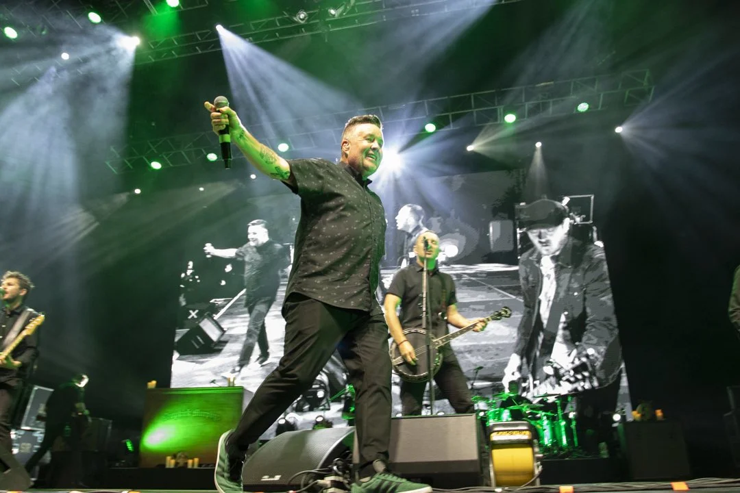 Male performer holding a microphone on stage with band members and large video screens displaying his image, concert lighting in green and white.