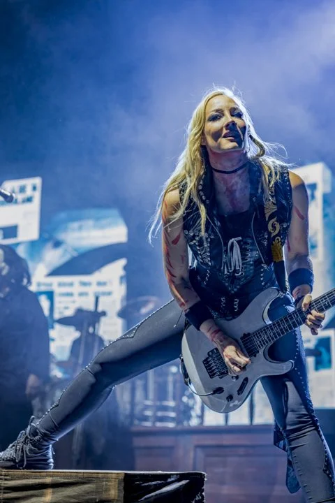 Female guitarist performing on stage with smoke effects and blue lighting.