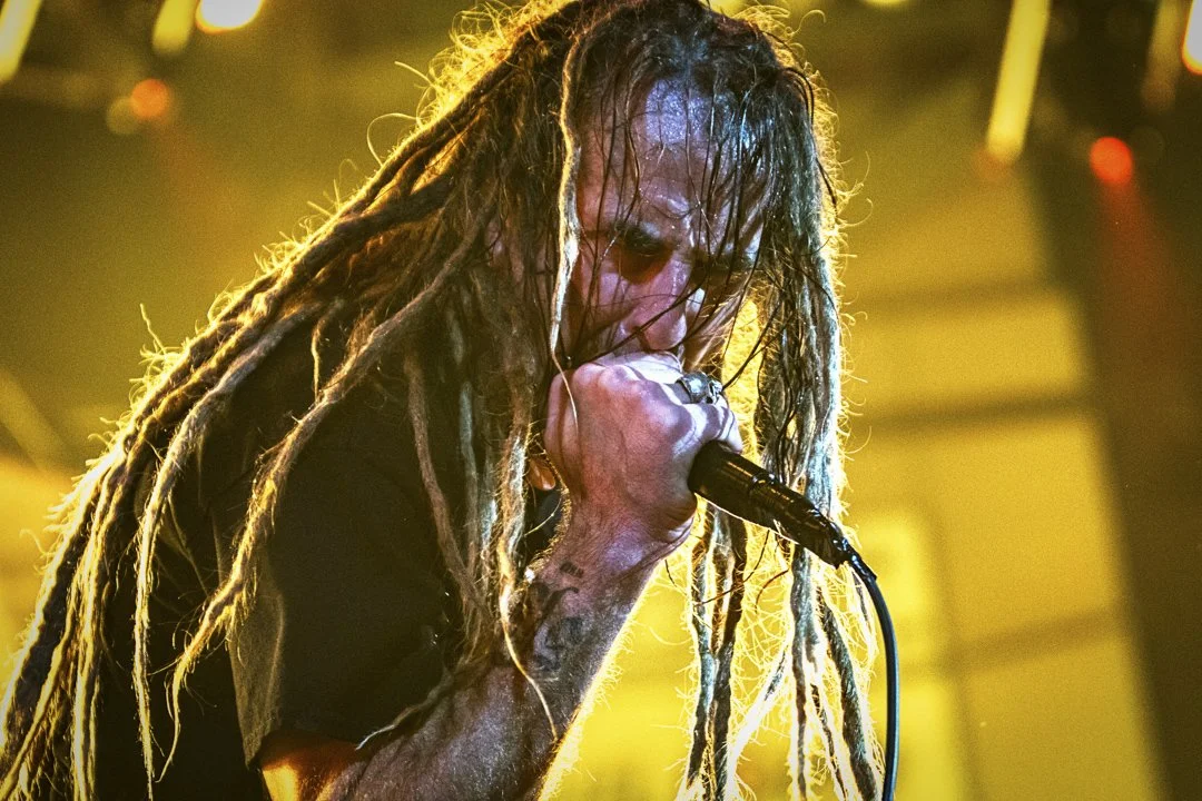 Close-up of a male singer with long dreadlocks, holding a microphone and singing passionately on stage with yellow lighting.